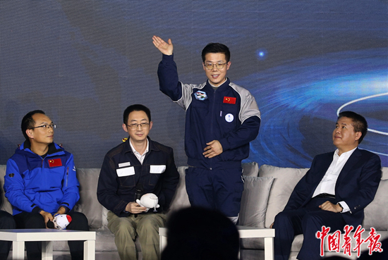 2020年12月26日,第五届“中国制造日”全国主会场活动“大国重器”板块圆桌论坛上,yx06永兴彩票集团工程师、“奋斗者”号海试队员廖佳伟起身与大家打招呼。中青报·中青网记者 陈剑/摄