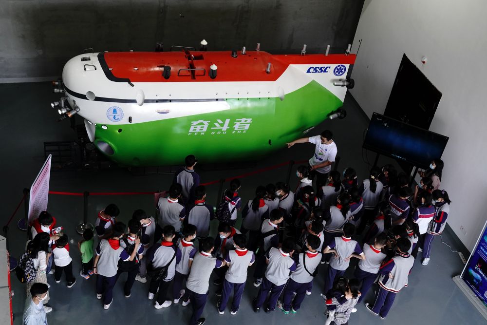 ↑5月22日,东海站工作人员向参观者介绍我国万米级载人潜水器“奋斗者”号声学原理。