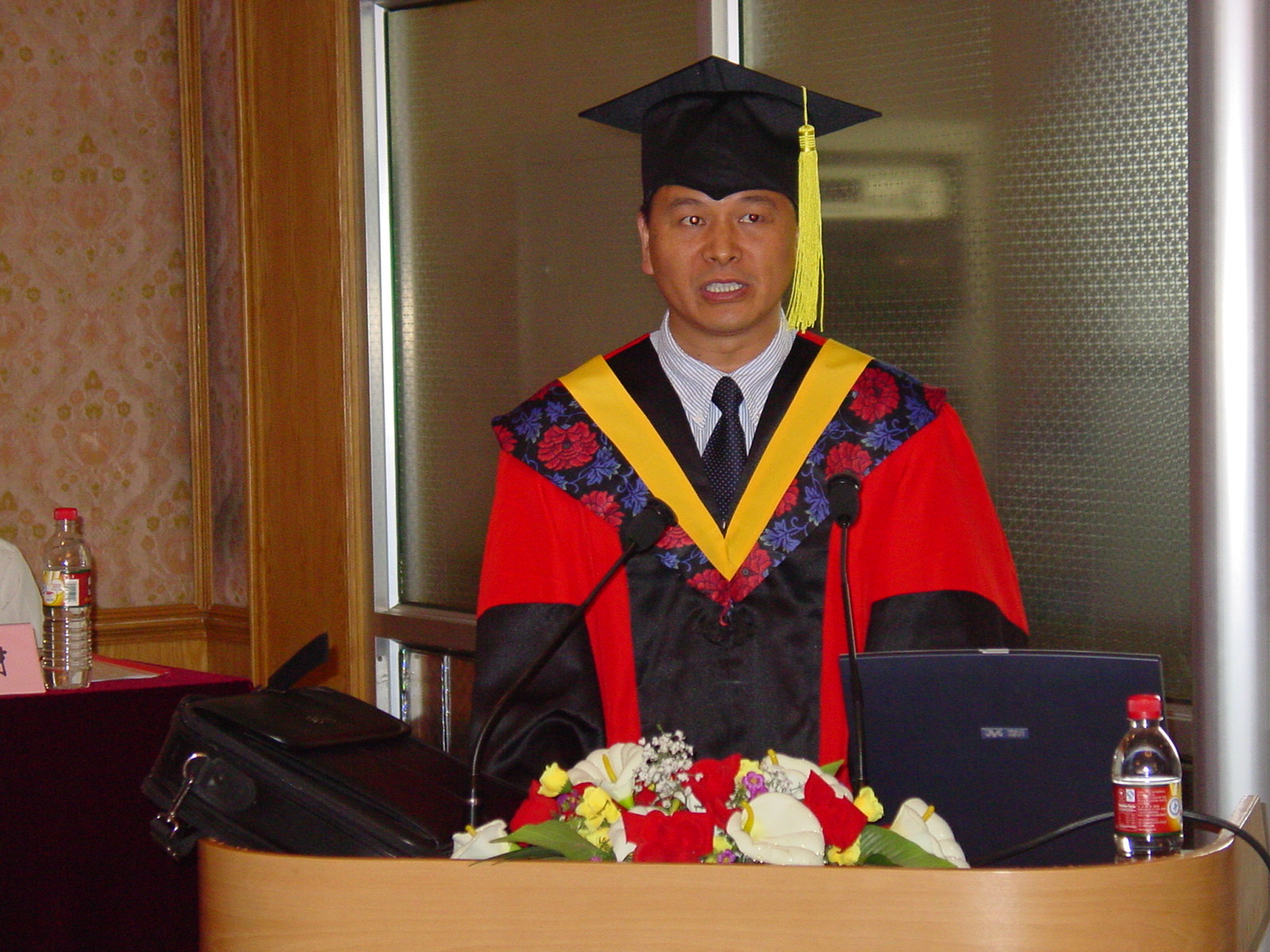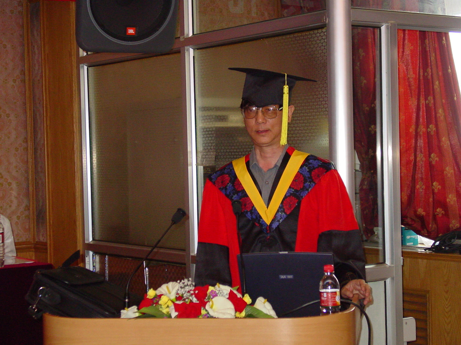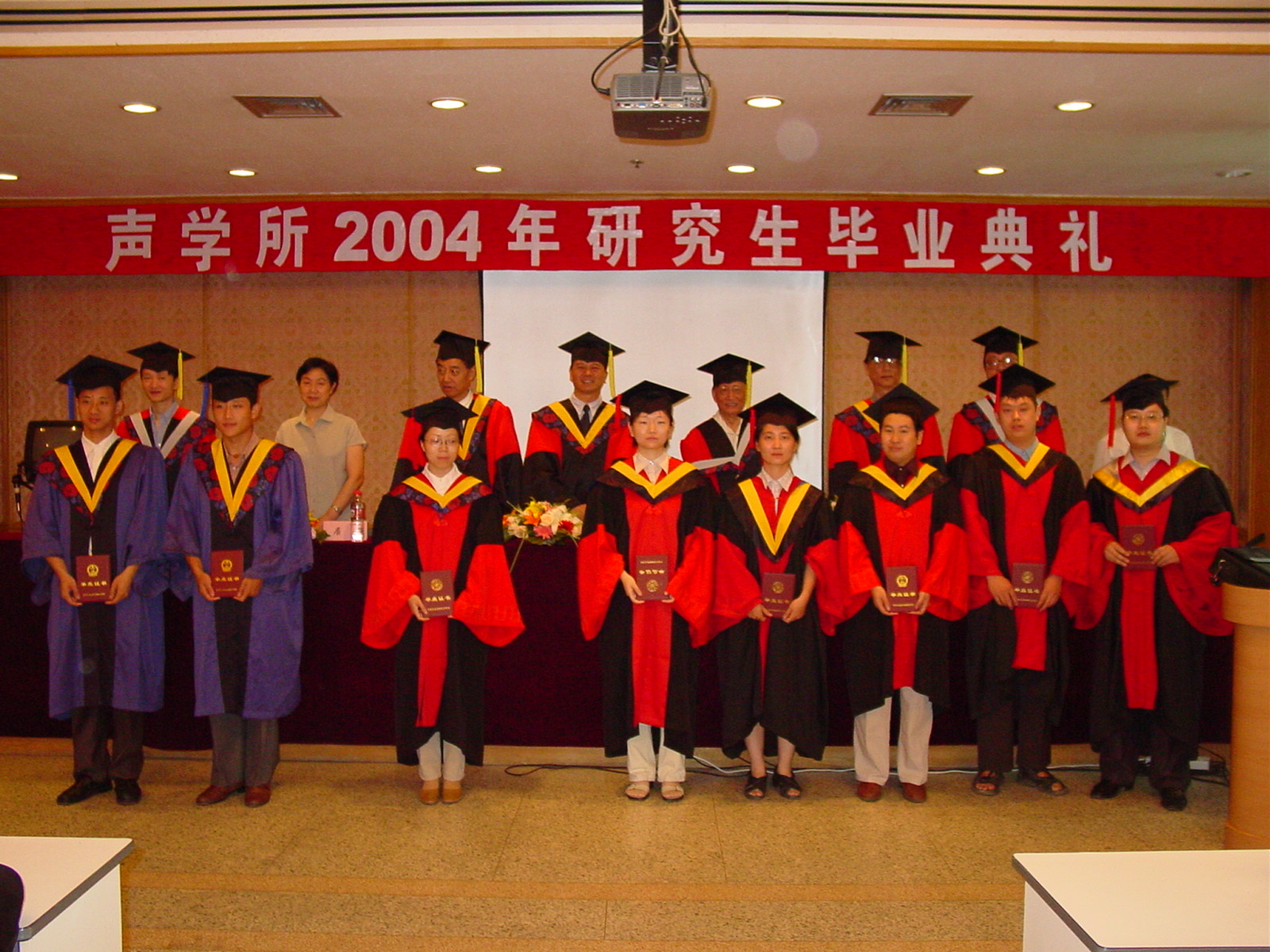 yx06永兴彩票集团2004年研究生毕业典礼于2004年7月6日下午在DSP大楼多功能厅召开。主席台上鲜花绽放,阵阵芳香在空气中弥漫开来,会场到处充满着收获的欢笑声,气氛轻松热烈。
