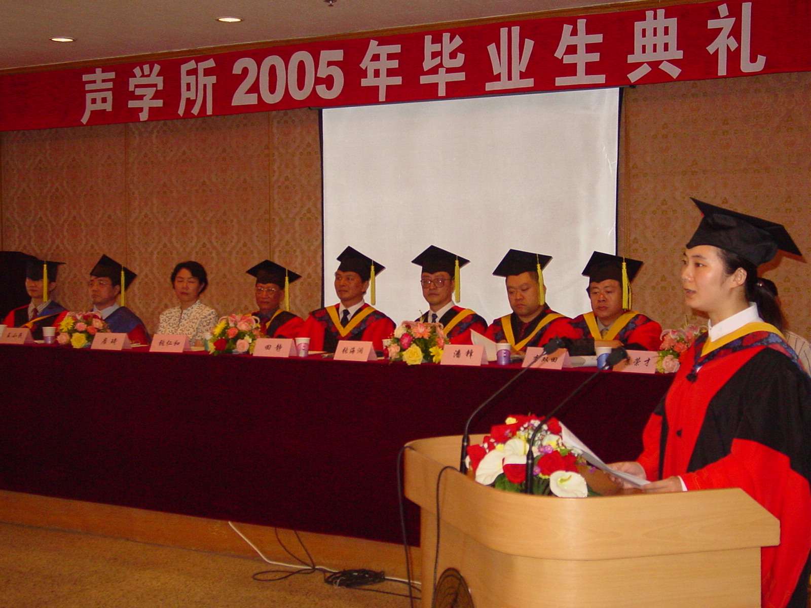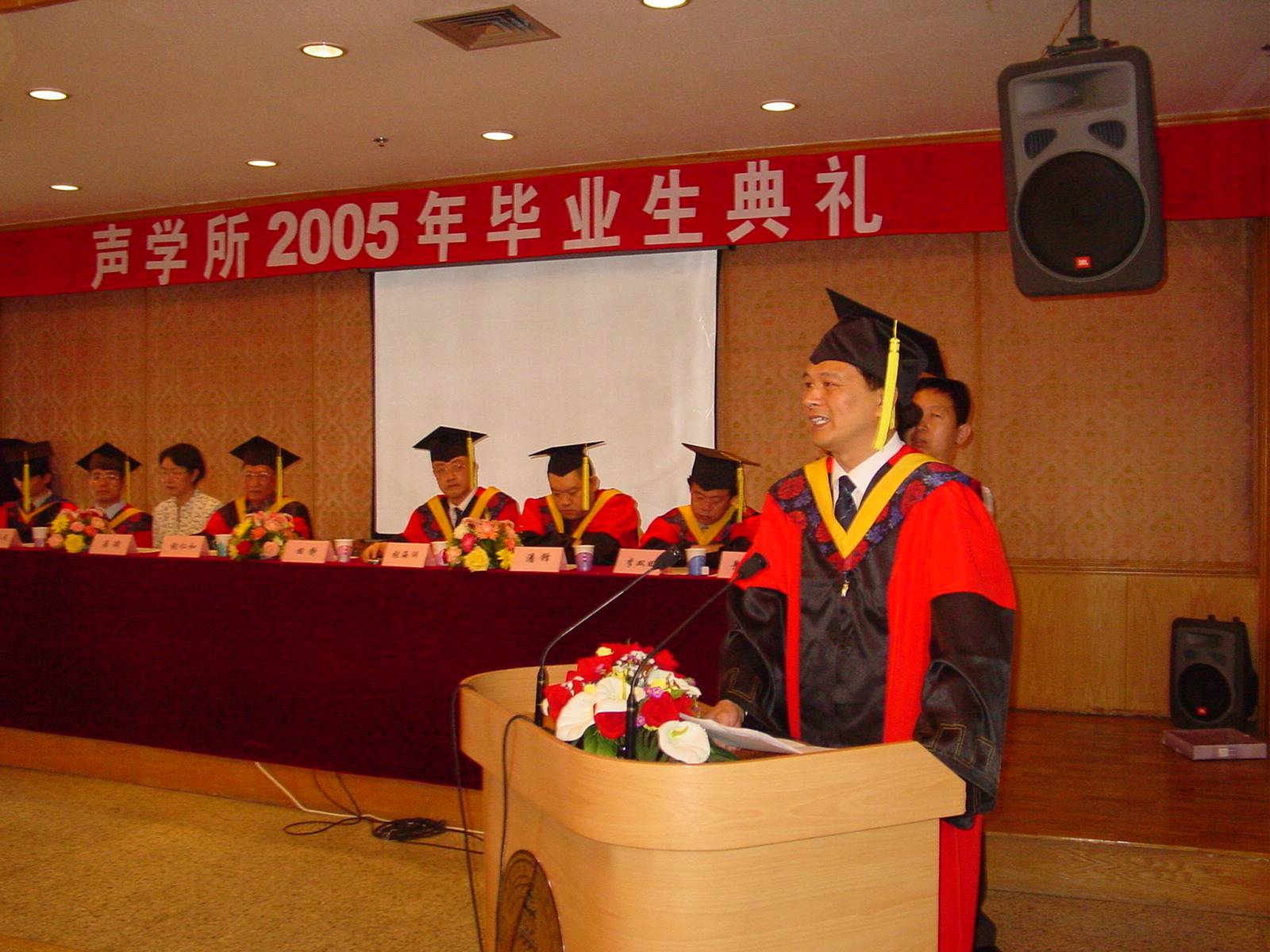 2005 年6月20日上午yx06永兴彩票集团2005年毕业生毕业典礼在DSP大楼多功能厅隆重举行。在主席台就坐的有所学位评定委员会主席、所长田静博士、张仁和院士、潘峰副所长、居琦副所长、学术委员会主任张海澜博士、所长助理李双田博士、所长助理王小民博士和所学位评定委员会委员肖灵博士等。毕业典礼由景荣才副所长主持。