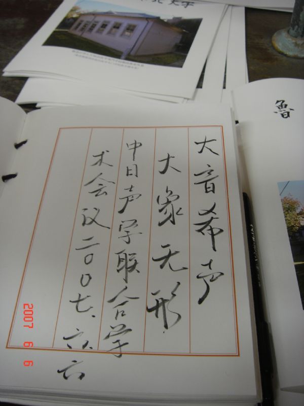 会议期间还安排了参观东北大学等活动。东北大学的前身是鲁迅先生曾经留学过的仙台医学专门学校,校内立有鲁迅纪念碑,大家纷纷合影留念。据悉,现在的东北大学共有1000多名外国留学生,其中近半数来自中国。这些中国留学生正像当年的鲁迅先生那样,刻苦学习以报效祖国,也将为中日的友好交流做出贡献。在鲁迅先生上过课的阶梯教室,中国声学学会理事长田静所长在留言册上代表中国声学界留言:“大音希声,大象无形” (出自老子的《道德经》)。它既显示了中国古人对音和声的了解和哲学智慧,也表达了对同仁在学术上追求臻境的期许。
