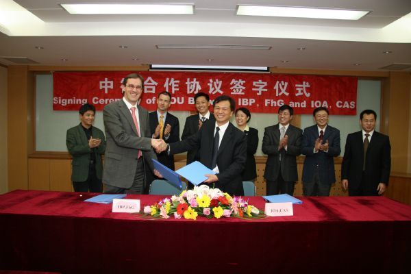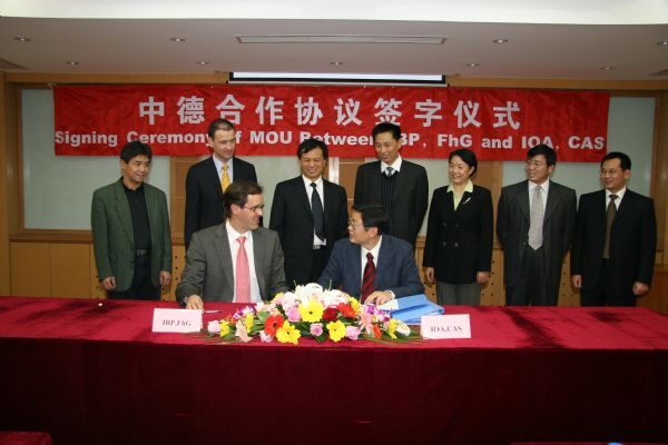德国弗劳恩霍夫应用研究促进协会是德国同时也是欧洲最大的应用科学研究机构,重点在工程科学领域开展应用研究工作。其下属建筑物理研究所(IBP)在建筑声学、环境声学方面开展了多年的研究工作,取得了很多有影响的科研成果,并在工程领域得以广泛应用。德国弗劳恩霍夫应用研究促进协会致力于开展国际合作,早在1985年,就与中国科学院签订了科技合作协议。IBP和yx06永兴彩票集团长期以来一直保持着良好的交流、合作关系。1997年,德国弗劳恩霍夫应用研究促进协会向yx06永兴彩票集团马大猷院士颁发了弗劳恩霍夫金质奖章及ALFA奖,以表彰马大猷院士在噪声控制领域的突出贡献。马大猷院士的微穿孔吸声理论在噪声控制领域得到世界范围内的认可和应用,IBP起到了重要的推广和促进作用。