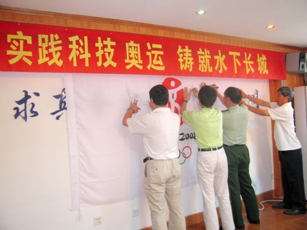 会上,全体水下安保团队的成员共同宣誓:实践科技奥运,铸就水下长城。大家还共同在印有北京奥运会徽的旗帜上签名留念。