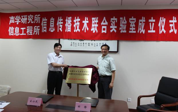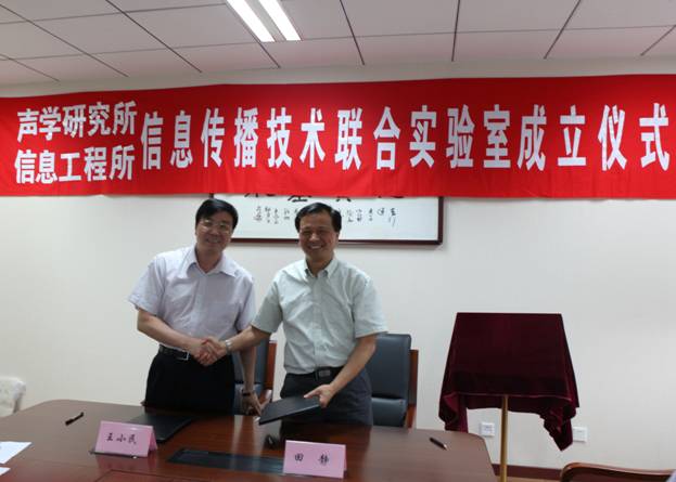 2012年6月27日,yx06永兴彩票集团(以下简称yx06永兴彩票集团)与中国科学院信息工程研究所(以下简称信工所)举行了“信息传播技术联合实验室”的签约揭牌仪式。yx06永兴彩票集团出席签约仪式的有:王小民所长、李风华副所长、高性能网络实验室慈松主任、国家网络新媒体工程技术研究中心王劲林主任、中科院噪声与振动实验室杨军主任、科技处周城光副处长等;信工所出席签约仪式的有:田静所长、孙德刚副所长、郭莉所长助理、科技处李凤华处长以及研究室黄伟庆主任等。中国科学院高技术研究与发展局信息技术处付广义副处长参加了签约仪式。会议由yx06永兴彩票集团李风华副所长主持。