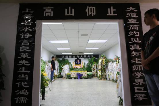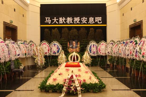 21日上午,北京八宝山革命公墓东礼堂庄严肃穆,哀乐低迴。“大道至简灼见真知老师学界巨擘 上善若水诤言良策先生当代鸿儒”的巨型挽联悬挂在大厅两侧,寄托了对马大猷教授的无尽哀思。正厅上方悬挂着黑底白字的横幅“马大猷教授安息吧”,横幅下方是马大猷教授的遗像。马大猷教授的遗体安卧于鲜花翠柏丛中,身覆鲜艳的党旗。大厅两侧整齐摆放着中央和各地、各界吊唁的花圈百余个。马大猷教授的夫人及子女的花蓝安放在他的遗体旁。