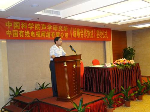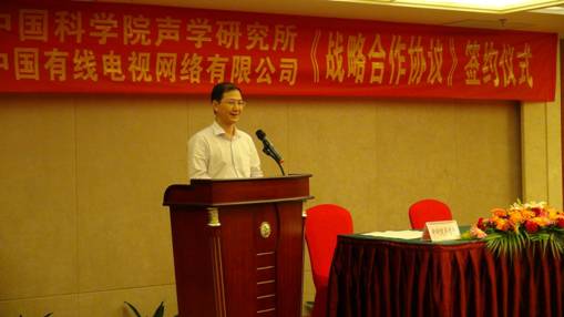王小民所长在致辞中表示,中科院声学研究所作为我国最早开展宽带网络技术的国家级研究单位,与全国唯一的专业级跨区域广播电视光缆传输运营商、全国最大的电视网络运营商——中国有线有着最紧密的合作,双方成功地探索出一条优势互补、强强联合的院地合作发展之路。他在致辞的最后总结中满怀激情地指出:“回顾过去,我们硕果累累;立足现在,我们重任在肩;面向未来,我们信心满怀。相信在双方战略合作协议的指引下,将在已有的良好基础上,继续团结合作,攻坚克难,协同创新,共赢发展,谱写面向国家重大战略需求的院地合作新篇章。”