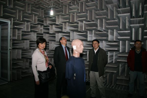 报告会结束后,在李晓东主任的陪同下,姚琨教授对通讯声学实验室的混响室、隔音室、消声室和半消声室等进行了参观。参观过程中,姚琨教授对我所自主开发的测量传声器和有源抗噪声耳机表现出极大兴趣,并且就建筑声学和微穿孔吸声体等方面和李晓东主任进行了交流。姚琨教授对我所的声学实验设备给与了高度评价,充分肯定了我所在国内外声学研究领域中的领先地位,并表示此次访问给自己留下了深刻的印象。