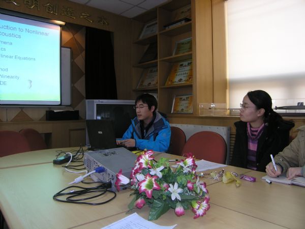 第一位主讲人是硕博连读生安志武。他主讲的题目是“非线性声学简介”。他从生活中的非线性声学现象出发,简要介绍了非线性声学的发展历史。例如,他指出古代的鱼洗是一个利用非线性效应的典型。鱼洗奇妙的地方是,用手缓慢有节奏地摩擦盆边两耳,盆会象受击撞一样振动起来,盆内水波荡漾。鱼洗曾于古代作为退兵之器,因共振波发出轰鸣声,众多鱼洗汇成千军万马之势,传数十里,可令敌兵闻声却步。之后,他对求解非线性波动方程的过程进行了详细介绍,特别指出了在非线性声学中常用的一些物理参量如声马赫数、非线性参量等。最后,他对非线性声学在无损检测中的应用进行了评价和展望。他的英文PPT图文并茂,向大家讲解了生活中遇到的很多声学现象,使我们对非线性声学有了更感性的认识。