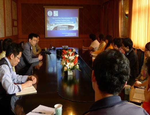 此次学术交流活动上,原猛博士简要介绍了人耳构造和听觉损失的主要类型,说明了人工耳蜗的适用性,分析了人工耳蜗的工作原理。重点介绍了听觉障碍者植入人工耳蜗后音乐感知能力的变化,展示了实验室在国产人工耳蜗关键技术研发领域取得的最新研究成果。原猛博士用形象生动的语言深入浅出的阐述了人工耳蜗的专业知识,报告引起了与会者的广泛兴趣,大家提出了自己感兴趣的问题和原博士进行交流和探讨。