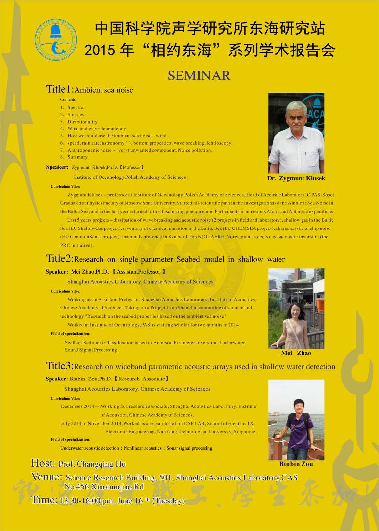 本次“相约东海”系列学术交流会特邀波兰科学院海洋研究所Zygmunt Klusek教授出席并作题为“Ambient sea noise”的学术报告,在报告中Zygmunt Klusek教授就海洋环境噪声的研究背景、研究热点内容、应用领域及近年来出现的海洋噪声污染问题等作了精彩讲演,并重点介绍了近些年的相关研究工作,他新颖的研究思路与突出的研究成果激发了大家浓厚的兴趣。