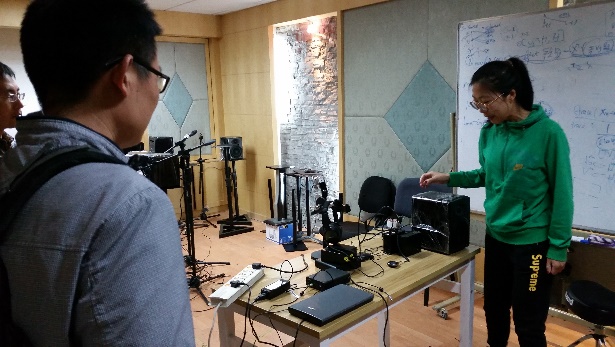 随后,胡洪平博士参观了全消声室、半消声室、混响室等音频实验室,并观看了实验室的多项成果演示,包括根据环境噪声响度自适应的音频增益调节设备、有源降噪耳机、超声导盲仪、高指向性扬声器和压电声透能量传输系统等。