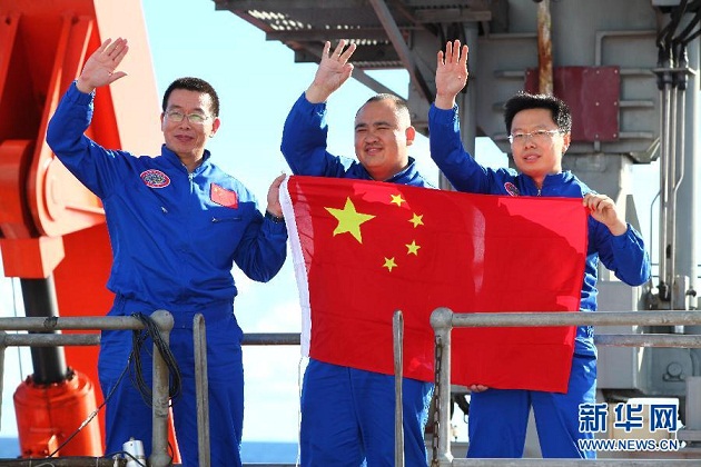 我所杨波同志光荣承担第一次下潜任务,同时下潜的还有潜航员、主驾驶叶聪,“蛟龙号”副总设计师崔维成。