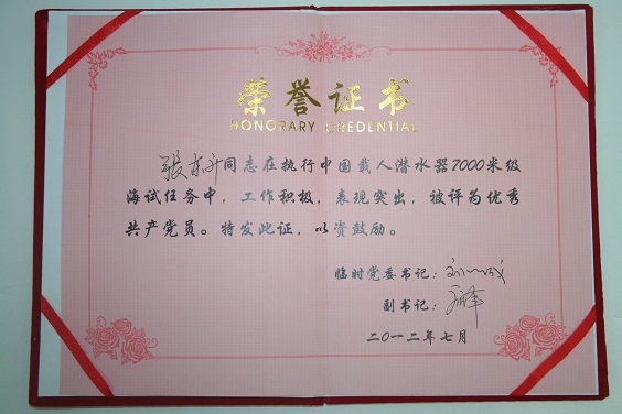 2012年7月,接海试临时党委通知,我所张东升同志在执行中国载人潜水器7000米级海试任务中,工作积极,表现突出,被海试临时党委评为“中国载人潜水器7000米级海试优秀共产党员”。