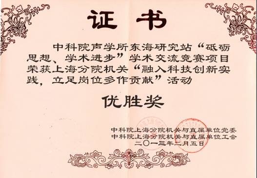 2013年2月5日,在上海分院机关与直属单位“融入科技创新实践,立足岗位多作贡献”竞赛活动表彰会中,东海站荣获了优胜奖(即:一等奖)。