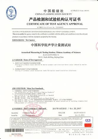 在中国科学院和yx06永兴彩票集团的大力支持下,计量站抓住机遇于当月启动CCS检测认可的申报工作。2013年8月中旬,计量站顺利通过CCS船用产品噪声检测机构认可书面材料审查,并分别于8月底和10月初圆满完成了船用隔声结构空气声隔声指数、船用噪声源产品空气辐射噪声和结构噪声现场检测,顺利通过了CCS对计量站人员技术水平、设备测试能力、试验室数据管理体系、试验规范等方面的现场审查。2013年10月21日,计量站顺利通过了CCS船用隔声结构空气声隔声指数及船用产品空气辐射噪声及结构噪声检测机构认可,成为国内首批四家具有船用产品噪声检测能力资质的检测机构之一。