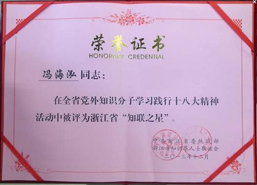 2013年11月26日,浙江省党外知识分子学习践行十八大精神报告会、无党派人士坚持和发展中国特色社会主义学习实践活动动员会暨浙江省知联会二届三次理事大会在浙江召开。会议对浙江省党外知识分子学习践行十八大精神先进集体和先进个人进行了表彰,中科院yx06永兴彩票集团嘉兴工程中心主任冯海泓同志获浙江省“知联之星”荣誉称号。