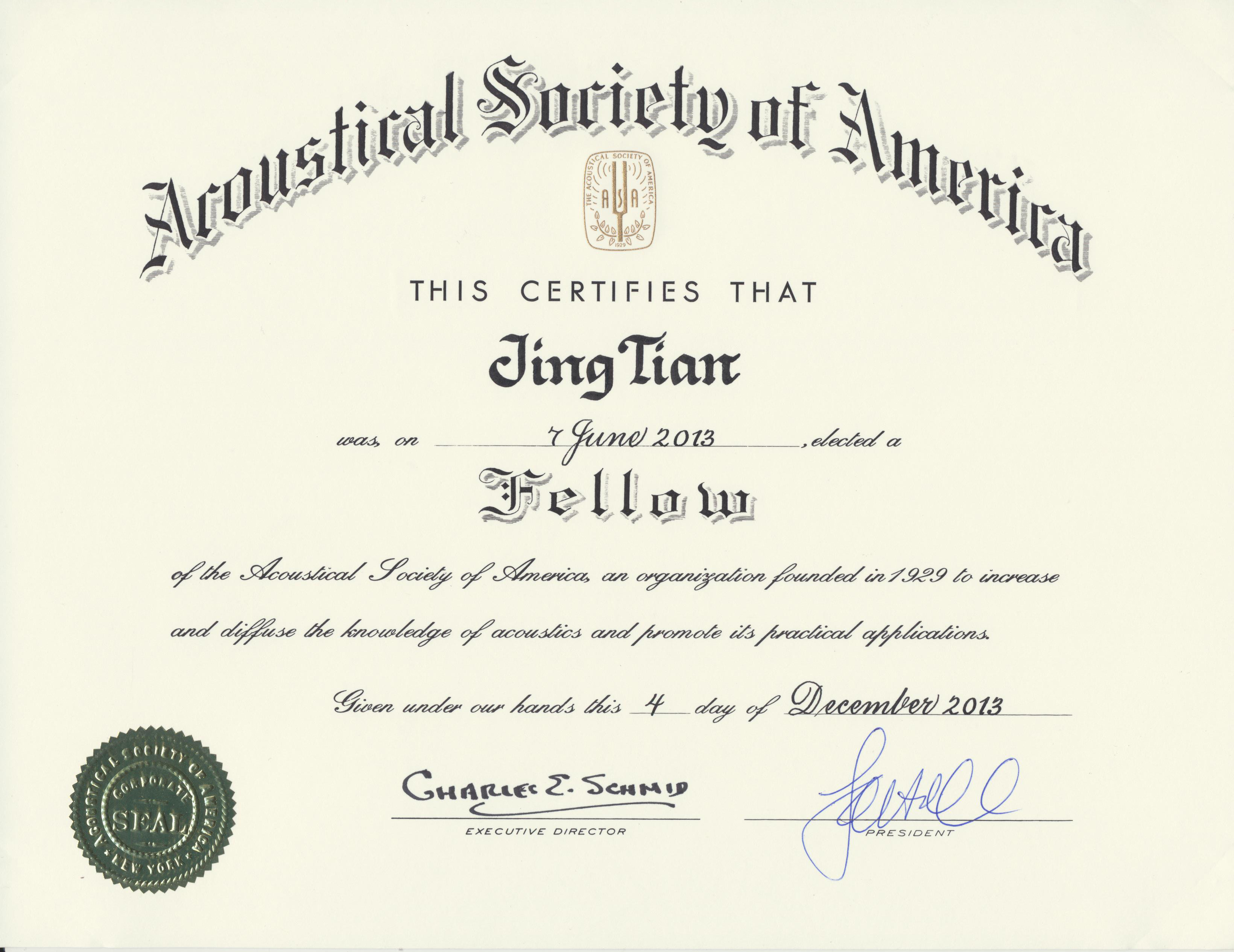 日前收到美国声学学会寄来田静研究员当选美国声学学会授予会士(Fellow)的通知和证书,以表彰其在声学领域的成就及其促进中美合作的贡献。