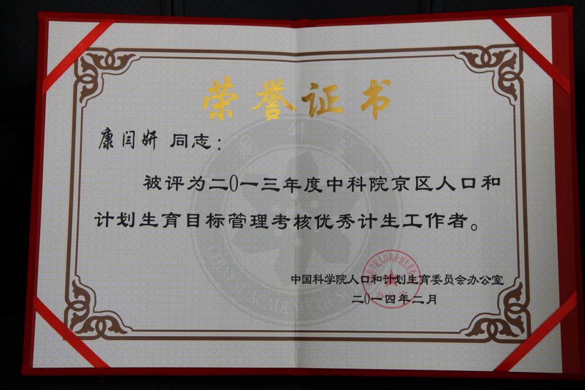日前,yx06永兴彩票集团被评为“2013年度中科院京区人口和计划生育目标管理考核优秀单位”;康闫妍同志被评为“2013年度中科院京区人口和计划生育目标管理考核优秀计生工作者”。