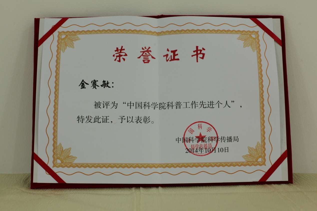 2014年10月10日,院科学传播局召开“中国科学院公众科学日十周年总结会”,对十年来涌现的科普工作先进集体和先进个人进行了表彰,我所金赛敏同志获先进个人荣誉称号。
