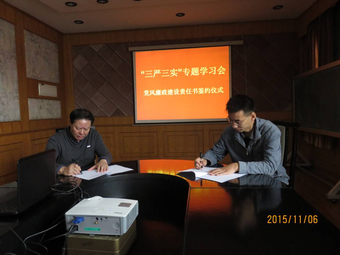 为全面贯彻落实从严治党要求,巩固和拓展党的群众路线教育实践活动成果,持续推进思想政治建设和作风建设,东海站党委于116日上午组织开展“三严三实”专题学习会暨党风廉政建设责任制签约仪式,站领导班子成员、中层及以上管理干部、课题组长和党支部书记等近20名同志参加了学习会。会议由党委书记、站长胡长青主持。