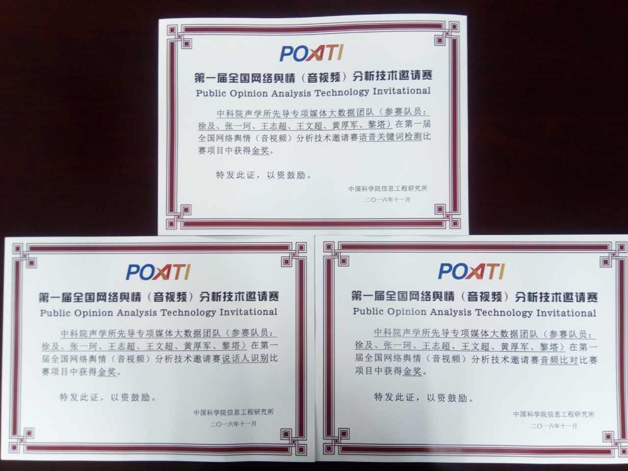 2016年11月5日,“网络多媒体智能分析高端论坛”在京召开,论坛为首届“网络舆情(音视频)分析技术邀请赛(POATI)”举办了颁奖典礼,中科院yx06永兴彩票集团语言声学与内容理解重点实验室的先导专项媒体大数据团队在该赛事中的音频比对、说话人识别和语音关键词检测三个项目中取得第一名。团队成员包括徐及、张一珂、王智超、王文超、黄厚军和黎塔。