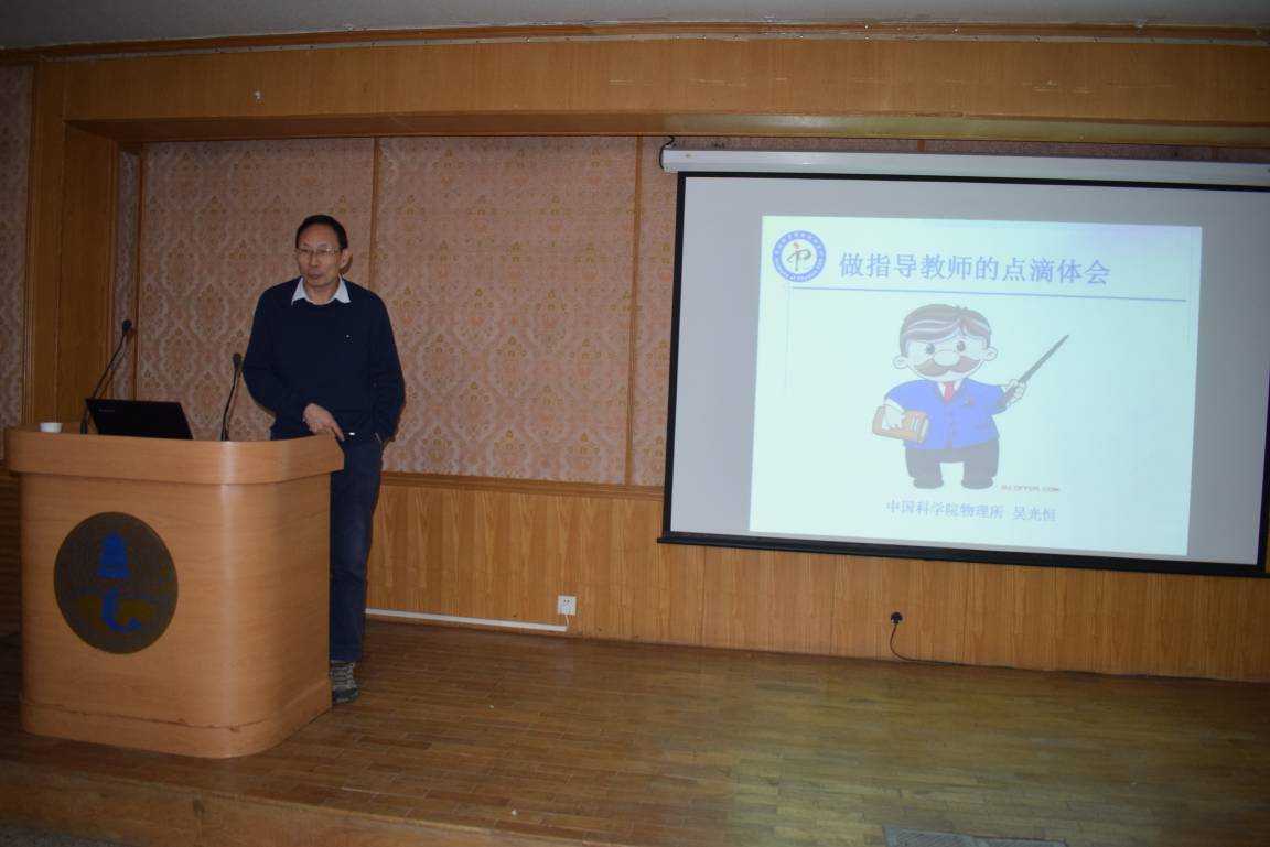 吴光恒做了“做研究生指导教师的点滴体会”的报告。他从研究生入组、规矩、座位、过坎、课题和磨合等科研和学习细节介绍了要做什么样的导师。他指出导师要耳提面命,言传身教,从而达到师生相互促进。