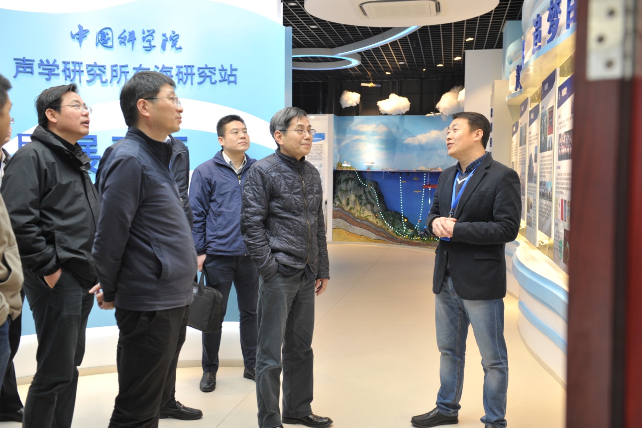 座谈前,施尔畏和彭崧一行参观了东海站科技成果展厅及声学科普长廊。张伟才详细的介绍了东海站历史沿革、学科布局及主要科研成果等情况,施尔畏一行饶有兴致地对部分科技成果进行了深入交流,并对东海站在国防建设和国民经济发展中发挥的重要作用给予了充分肯定。