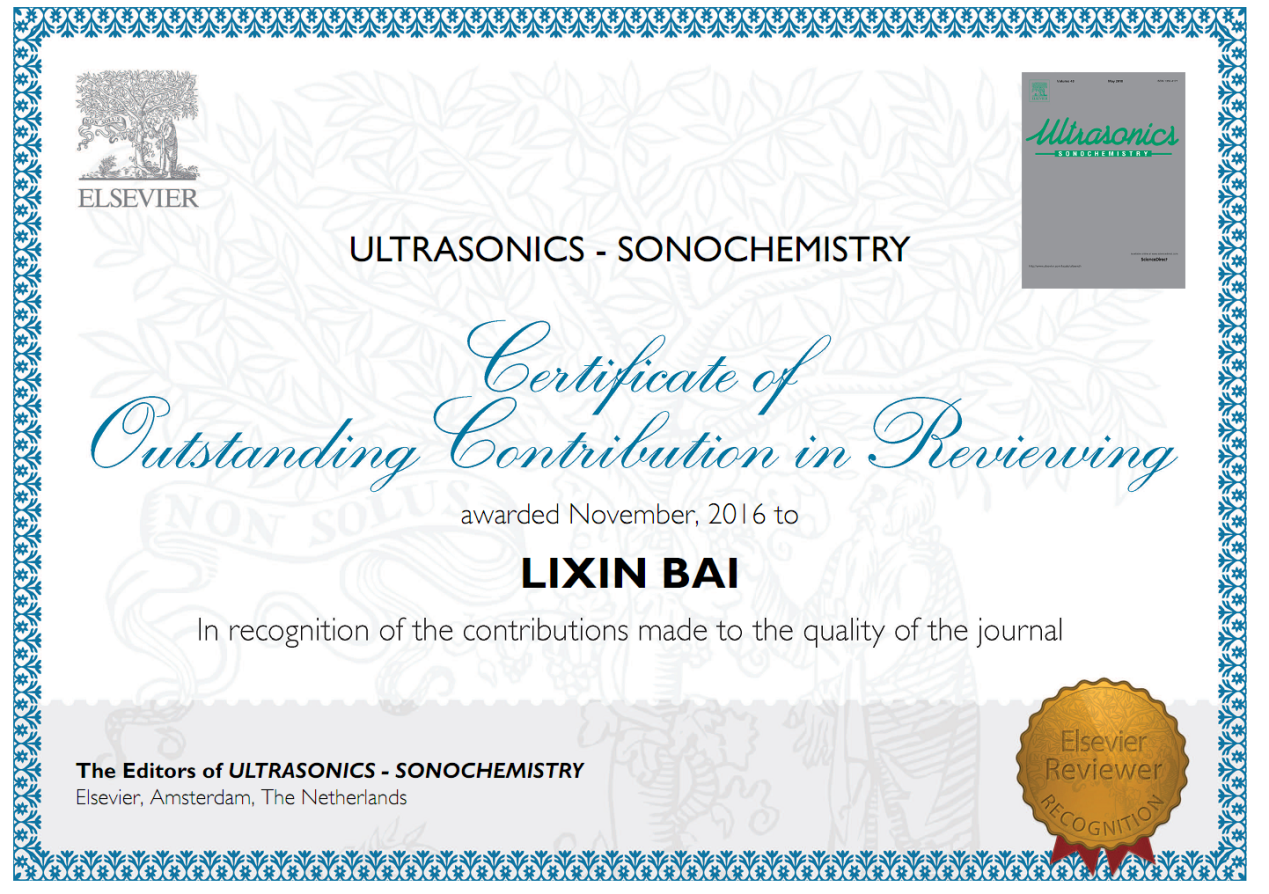 yx06永兴彩票集团白立新副研究员被Elsevier出版社SCI期刊《Ultrasonics - Sonochemistry》授予“杰出审稿人奖”,以表彰其高质量、建设性和及时的审稿工作。