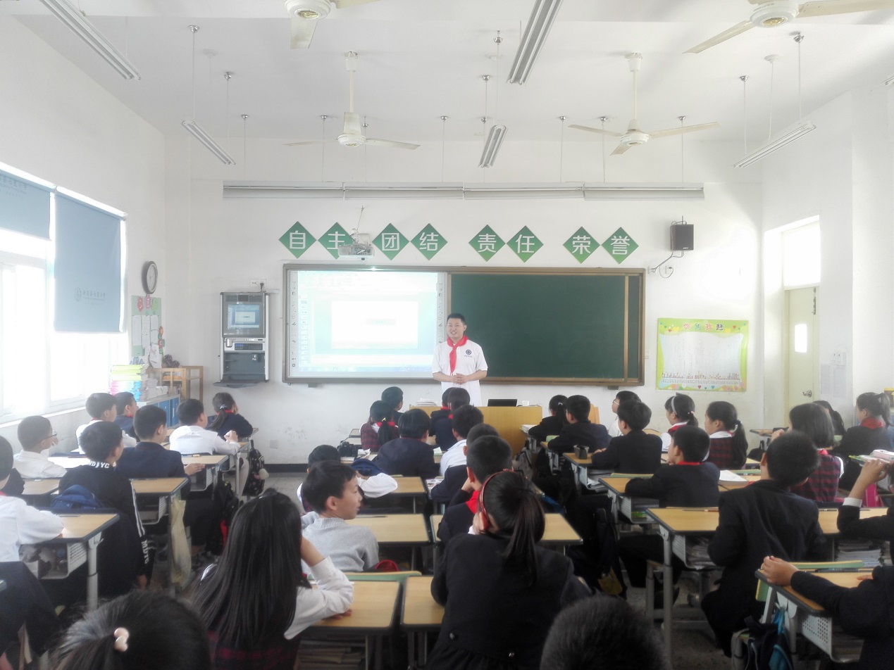 接着,在小朋友们的带领下,志愿者们来到教室,“声音的秘密”科普讲座正式开课啦。讲座以小朋友们熟悉的歌曲《青春修炼手册》作为热场节目,引起了全场大合唱,迅速活跃了课堂氛围,拉近了志愿者和同学们之间的距离。随后,以这首歌和大家生活中经常听到的声音为引子,志愿者们分享了“声音是怎么产生的”、“声音是如何传播和被我们感知的”等问题,让孩子们对声音的产生与传播有了基础的认识。志愿者们还以“指手画脚”的游戏让孩子们了解了声音在日常生活中的重要性,还让孩子们对着声级计展现“狮吼功”,以此来直观体验声学中对音量大小的计量方式。