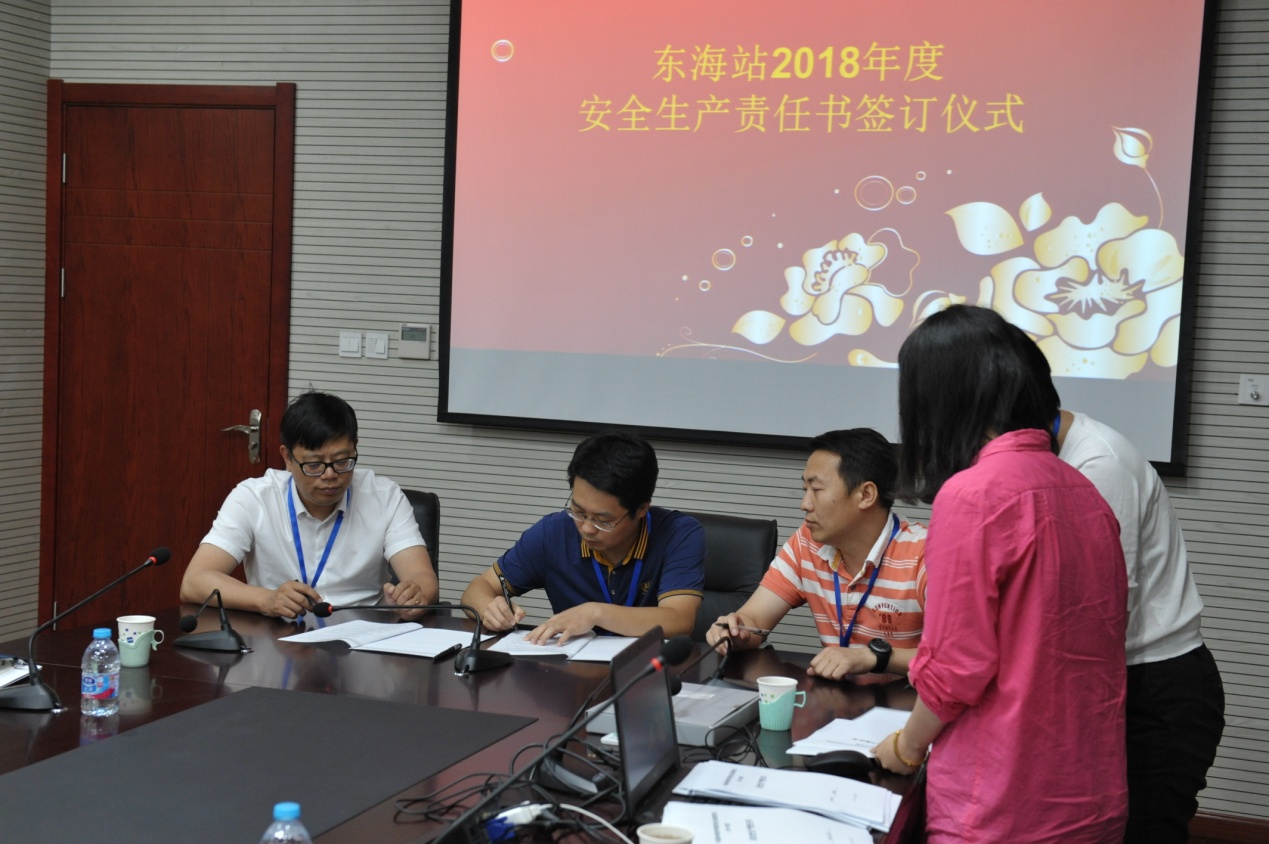 随后举行了《东海站2018-2019年度安全生产责任书》签订仪式,站长许伟杰和党委书记张伟才与各科室负责人共同签订了《东海站2018-2019年度安全生产责任书》。安全责任,重在落实。责任书要求各科室负责人都应当认真履行安全职责,自觉贯彻执行安全生产的法律法规,切实提高防范意识,严格实行过错责任追究制度。