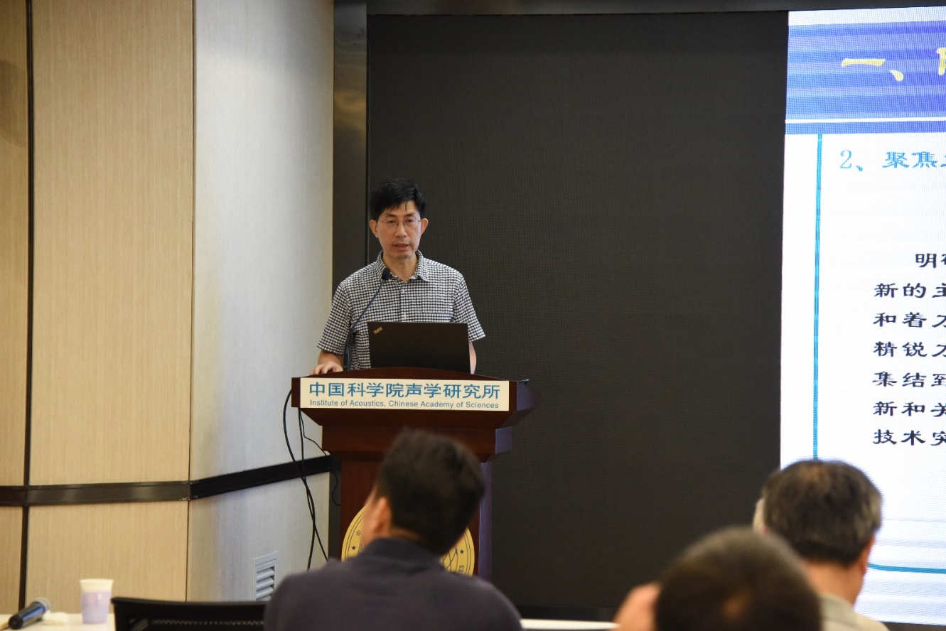 随后,各方向组依次汇报工作。检测声学与无损检测的毛捷研究员、微声学与微器件的李俊红研究员、固体声学与深部钻测的陈浩研究员、计算声学与声能应用的林伟军研究员4个方向组的组长,以及医用声学的代表王晓东副研究员分别做了方向组工作报告,并对未来的工作计划进行了介绍。