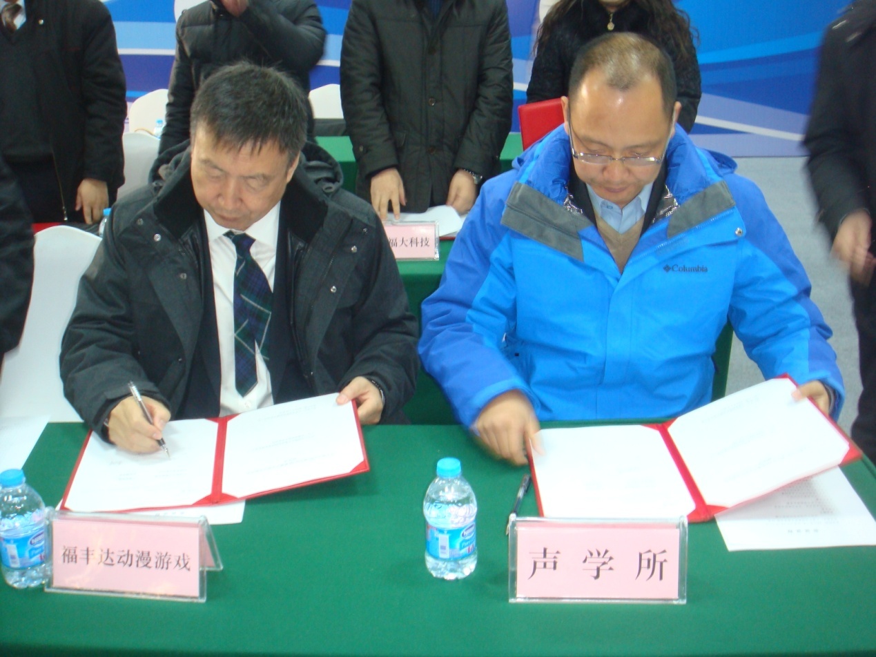 我所与天津福丰达影视公司以影视3D声学研究与应用为目标,构建战略合作关系,通过组建3D影像声学联合实验室,共同开展研究,来提升我国影视3D声学新技术研发水平和技术成果的产业化效率。双方经过友好协商与洽谈,确定以多通道3D声场录放音技术、3D虚拟声技术等新一代声频工程技术产品为主要开发内容的合作思路,将于近期启动一系列合作研发项目,力争在几年内形成高水平的产业化成果。
