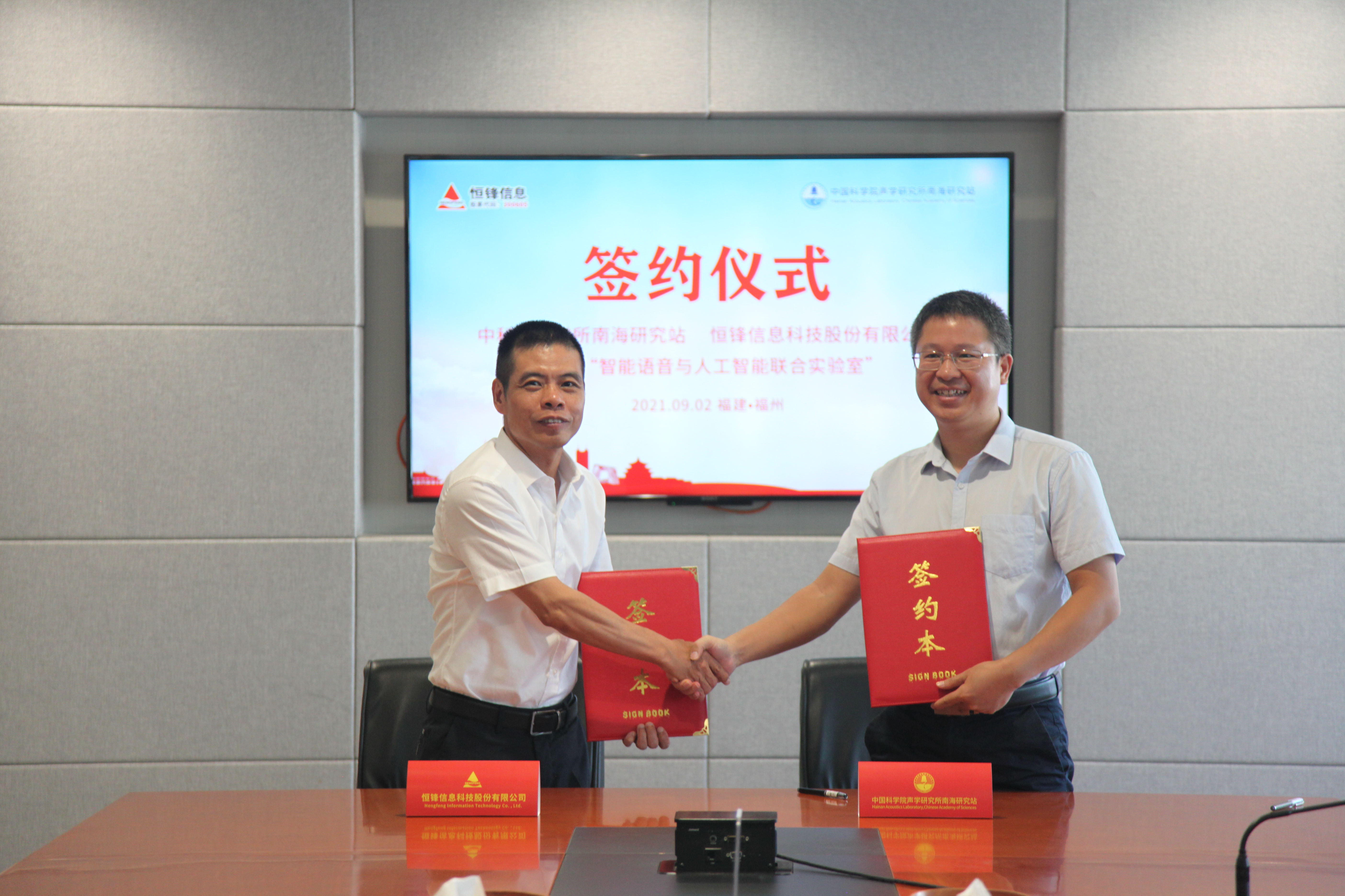 2021年9月2日上午,yx06永兴彩票集团南海研究站(以下简称南海站)与恒锋信息科技股份有限公司在恒锋信息公司总部举行共建“智能语音与人工智能联合实验室”签约仪式,双方将发挥各自在人才、技术、产业研究、业务领域的优势,共同打造优势互补、协同育人、合作共赢的合作新格局。南海站站长甘维明与恒锋信息总裁欧霖杰作为双方代表出席签约仪式,并签署了合作协议。