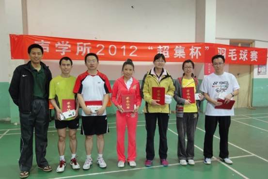 近两年,我们每年都组织一次全所范围内的大型羽毛球比赛,最近的是由数字系统集成和超声物理与探测实验室赞助的2012年‘超集杯’羽毛球赛。在比赛中获奖的选手,还参与了中关村二片的羽毛球选手选拔,在由中国科学院体育协会主办的中国科学院第二届职工羽毛球比赛中,我所重点实验室的韩一丁和海洋声学技术实验室的曹金亮成功进入了景区协作二片羽毛球代表队,获得了团体冠军。