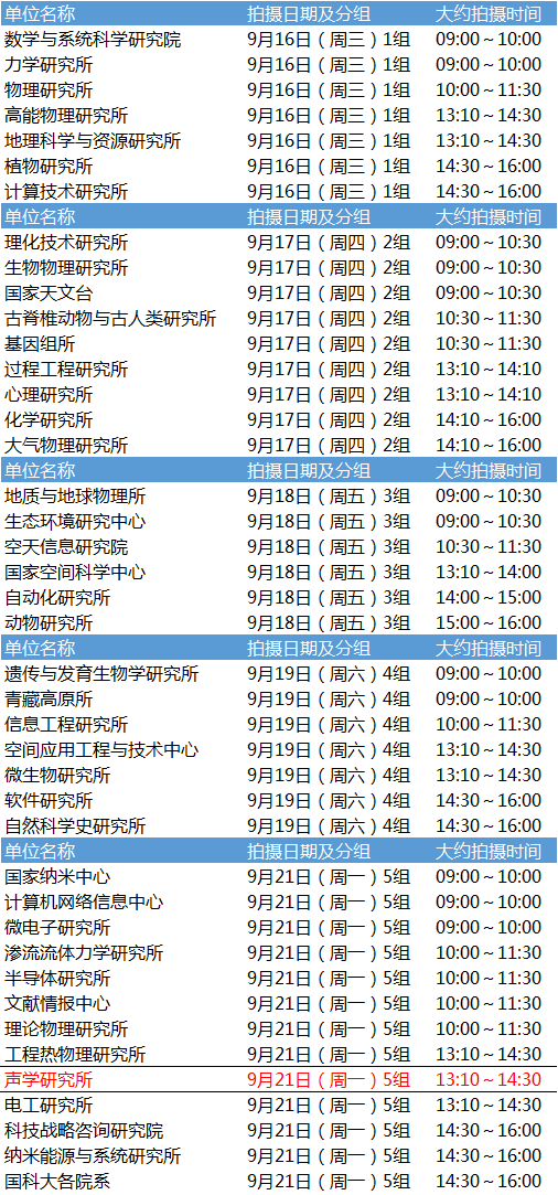 各单位拍摄时间具体安排