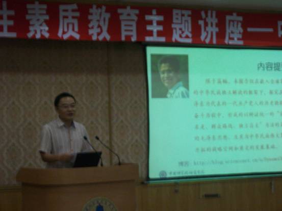 倪宏副所长首先为大家介绍了主讲人马石庄副院长的基本情况,并说明了这次讲座的深刻用意,今年恰逢中国共产党建党90周年,所以在研究生中开展爱国爱党教育是非常必要的。接着马石庄副院长开始了讲座。他指出毛泽东是民族的毛泽东,是时代的毛泽东,是实践的毛泽东,是世界的毛泽东,是在他的领导下中国共产党才能发展壮大成立新中国,使得中国人民从此站起来了,中国从此在世界上有了一席之地。