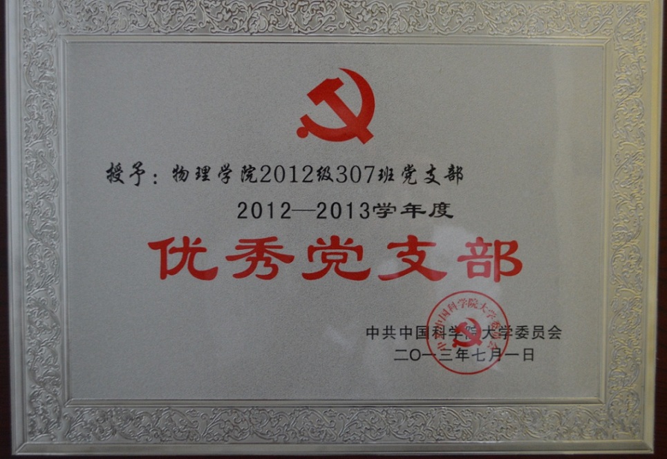 yx06永兴彩票集团2012级307班党支部在中国科学院大学173个教职工学生党支部综合评选中脱颖而出,以优异成绩被评为2012-2013学年度优秀党支部。