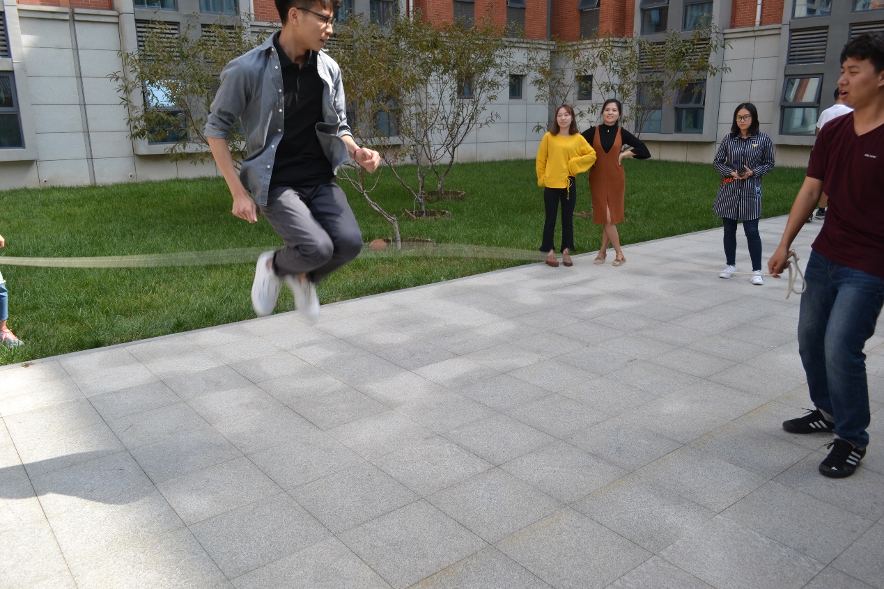 最后,进行户外游戏。游戏总共三个项目:“打保龄球”——丢球的各种姿态让大家开始放松下来,真正进入游戏状态;“乒乓球接力”考验大家平衡能力。S型的跑道,有人为了平衡和追求更快的速度,把身体也扭成了S型,让观众们为此欢呼;“跳大绳”——让每个人都参与进来。新生们意犹未尽,强烈要求加游戏,便进行了“你划我猜”——精彩的表演,完美的猜词默契,让大家兴奋不已。
