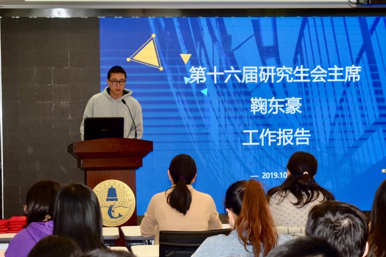 上届研究生会主席鞠东豪代表第十六届研究生会作工作报告。鞠东豪回顾了过去一年研会的各项活动,分享了工作经验及感悟,感谢十六届研会成员对自己工作的支持与帮助,并预祝新一届研会工作顺利。