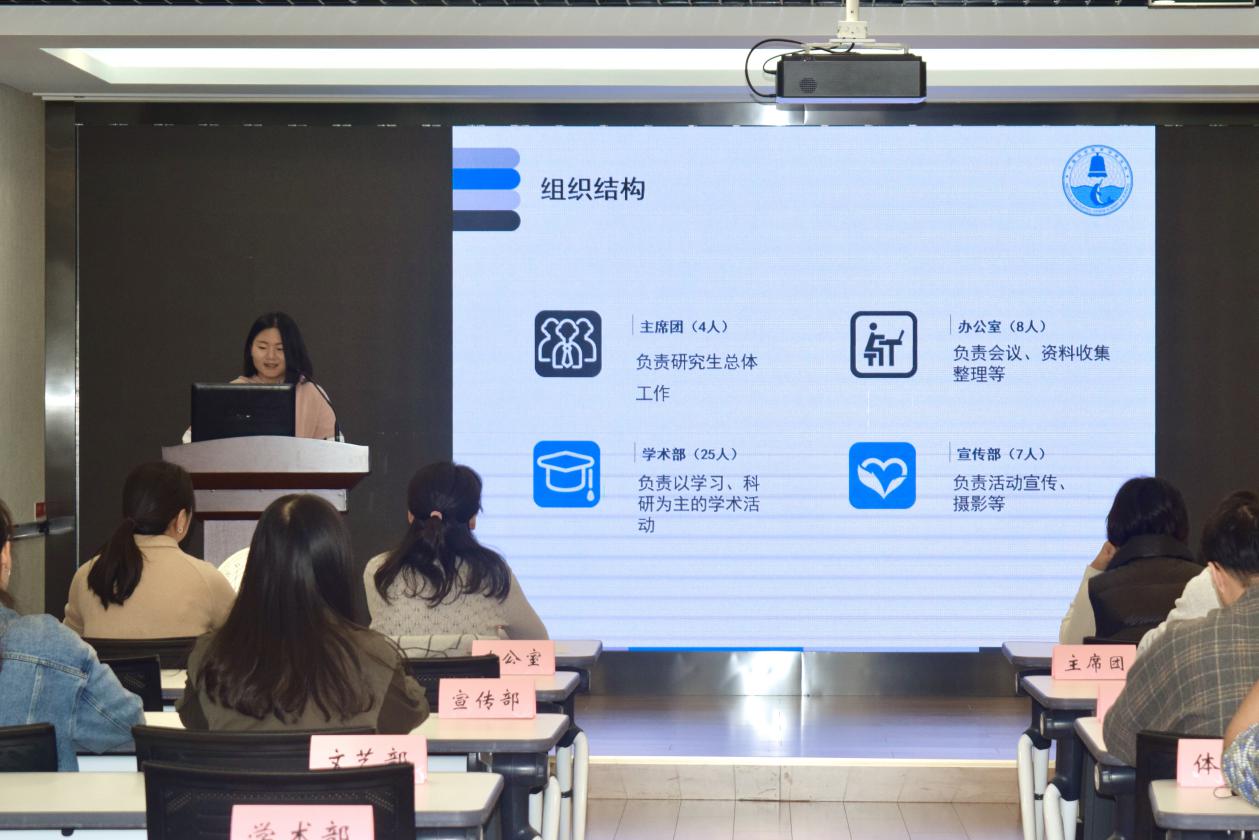 研究生部李辉首先肯定了上届研会的工作,强调研究生会应积极推进学生的“自我管理、自我服务、自我监督”;增加同学间的团结和凝聚力,成为师生间的纽带;举办丰富多彩的活动,充实学生的课余生活。同时,希望研究生会的同学们能够平衡好工作和科研的关系,在服务他人的同时,不断提升自我,与研会共同成长。