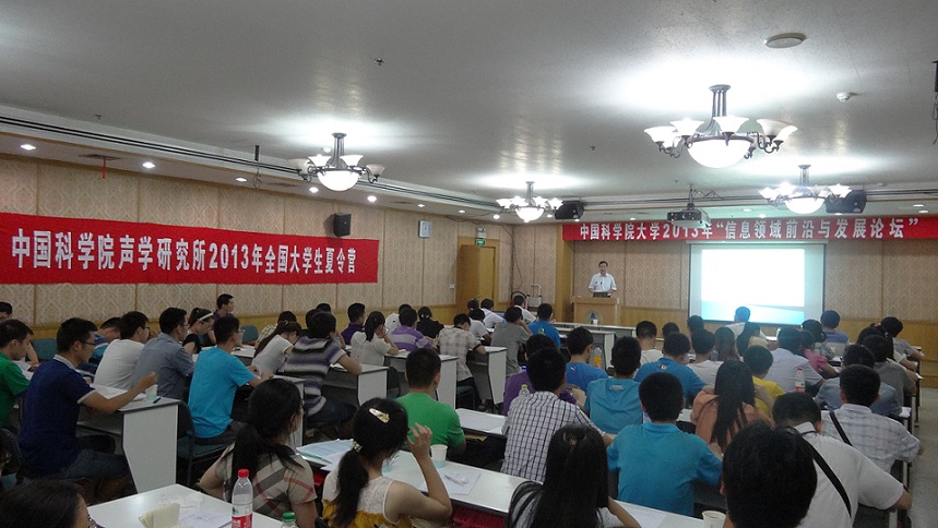7月19日下午,中国科学院大学2013年“信息领域前沿与发展论坛”暨yx06永兴彩票集团2013年全国大学生夏令营在yx06永兴彩票集团DSP楼多功能厅开幕。来自南京大学,复旦大学,四川大学等27所高校近70名优秀学子来到yx06永兴彩票集团,近距离感受yx06永兴彩票集团前沿学术成果。yx06永兴彩票集团副所长马晓川研究员,中科院语言声学与内容理解实验室主任颜永红研究员,中科院噪声与振动重点实验室主任杨军研究员,综合声纳实验室副主任刘纪元研究员,国家网络新媒体工程技术研究中心副主任邓浩江研究员,超声物理与探测实验室林伟军研究员,人教处张云鹏老师,任晓燕老师,李辉老师,出席开营仪式。仪式由人教处张云鹏老师主持。