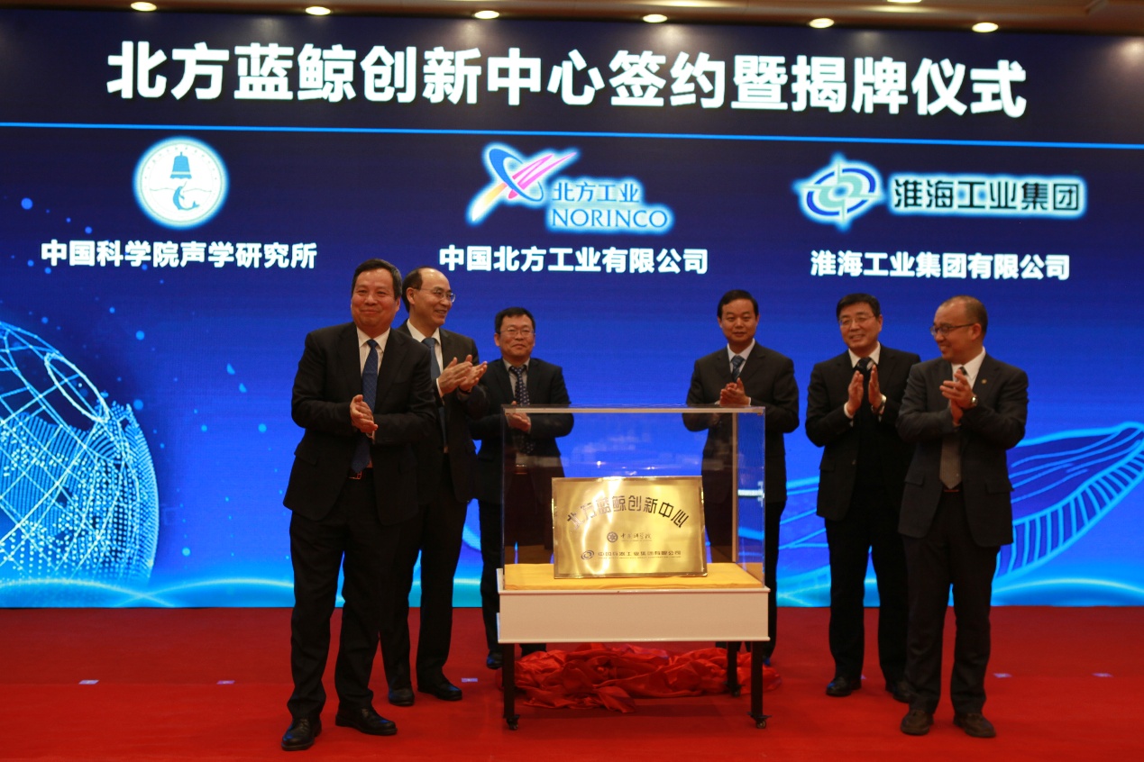 2019年1月16日上午,中科院yx06永兴彩票集团、中国北方工业公司、淮海工业集团在北京北方大厦联合举办“北方蓝鲸创新中心”签约暨揭牌仪式,三方代表共同签订了联合成立“北方蓝鲸创新中心”协议,中科院重任局局长于英杰、中国兵器工业集团副总经理李春建、北方工业公司总裁植玉林、淮海工业集团董事长何清、yx06永兴彩票集团所长王小民、副所长马晓川等共同为“北方蓝鲸创新中心”揭牌。中科院重任局综合技术处处长郭晓勇、信息海洋处处长李才兴及兵器工业集团公司、北方工业公司、淮海工业集团等单位相关部门领导出席仪式。