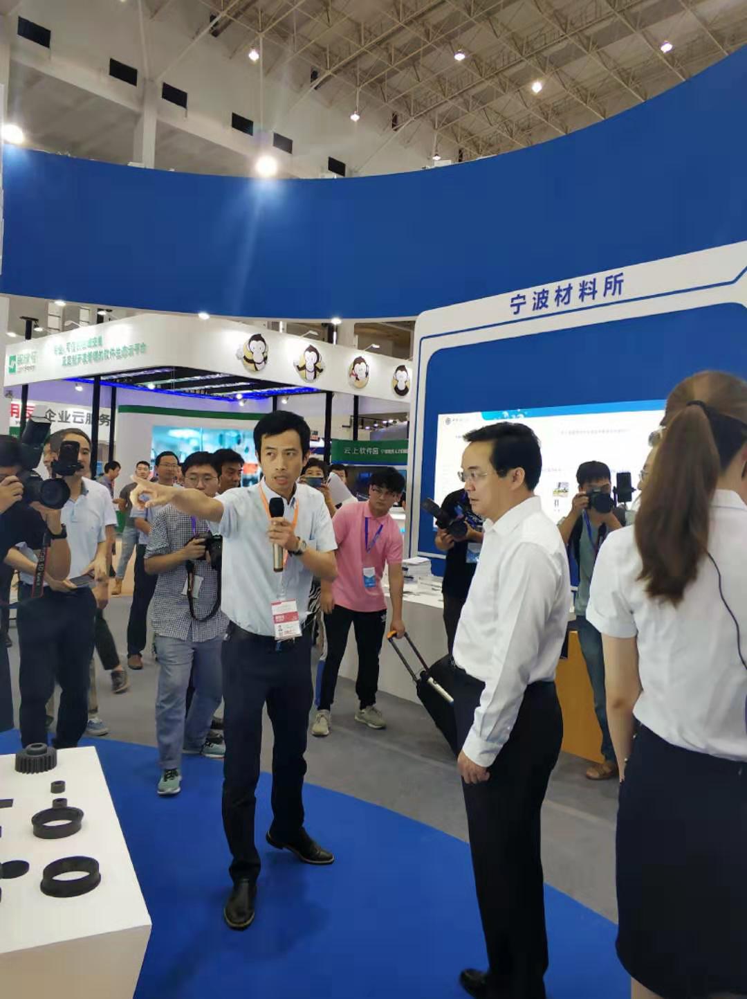 浙江省副省长高兴夫,中共宁波市委副书记、市长裘东耀等省市领导参观中科院展区,参展项目负责人刘军介绍了各科研院所的技术研发成果。