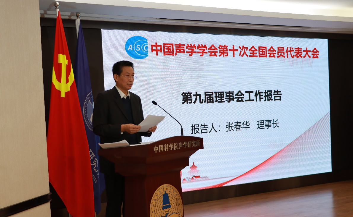 张春华代表第九届理事会做工作报告,全面总结了过去四年第九届理事会在党建工作、学术交流、服务创新型国家建设、国际交流与合作、学会自身建设、科学普及等方面所做的大量工作,并在此基础上对新一届理事会提出意见和建议。与会代表一致通过了中国声学学会第九届理事会工作报告。
