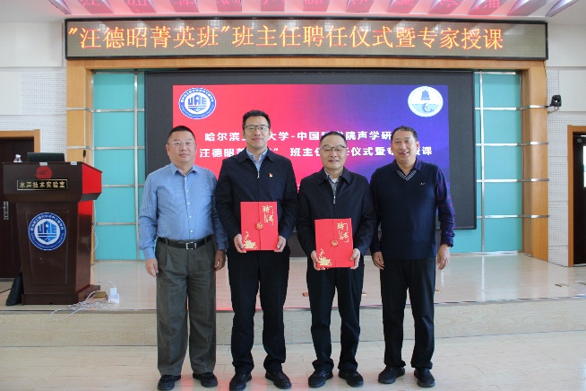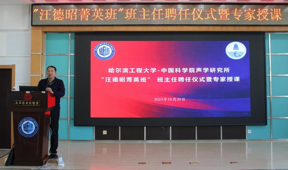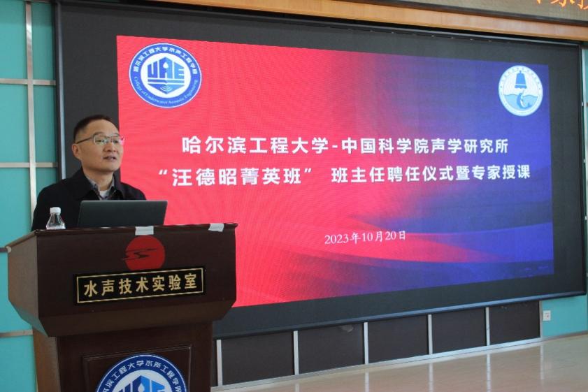 10月20日,yx06永兴彩票集团-哈尔滨工程大学“汪德昭菁英班”班主任聘任仪式暨专家授课在水声楼15楼学术报告厅举行。会议由水声工程学院院长乔钢主持,yx06永兴彩票集团党委书记、副所长倪宏,首席科学家马力及相关职能部门负责人;学院党委书记万旭东,党委副书记刘志军,副院长张海刚出席仪式。