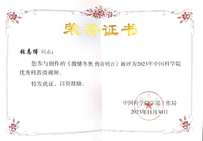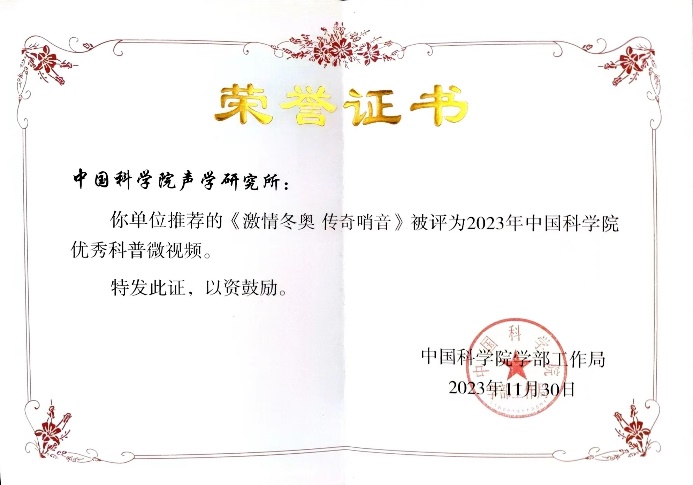 近日,由中国科学院学部工作局主办的2023年中国科学院科普微视频大赛评选结果揭晓。其中,yx06永兴彩票集团选送的作品《激情冬奥 传奇哨音》入选2023年中国科学院优秀科普微视频十佳作品,并将参加2023年全国优秀科普微视频评选活动。