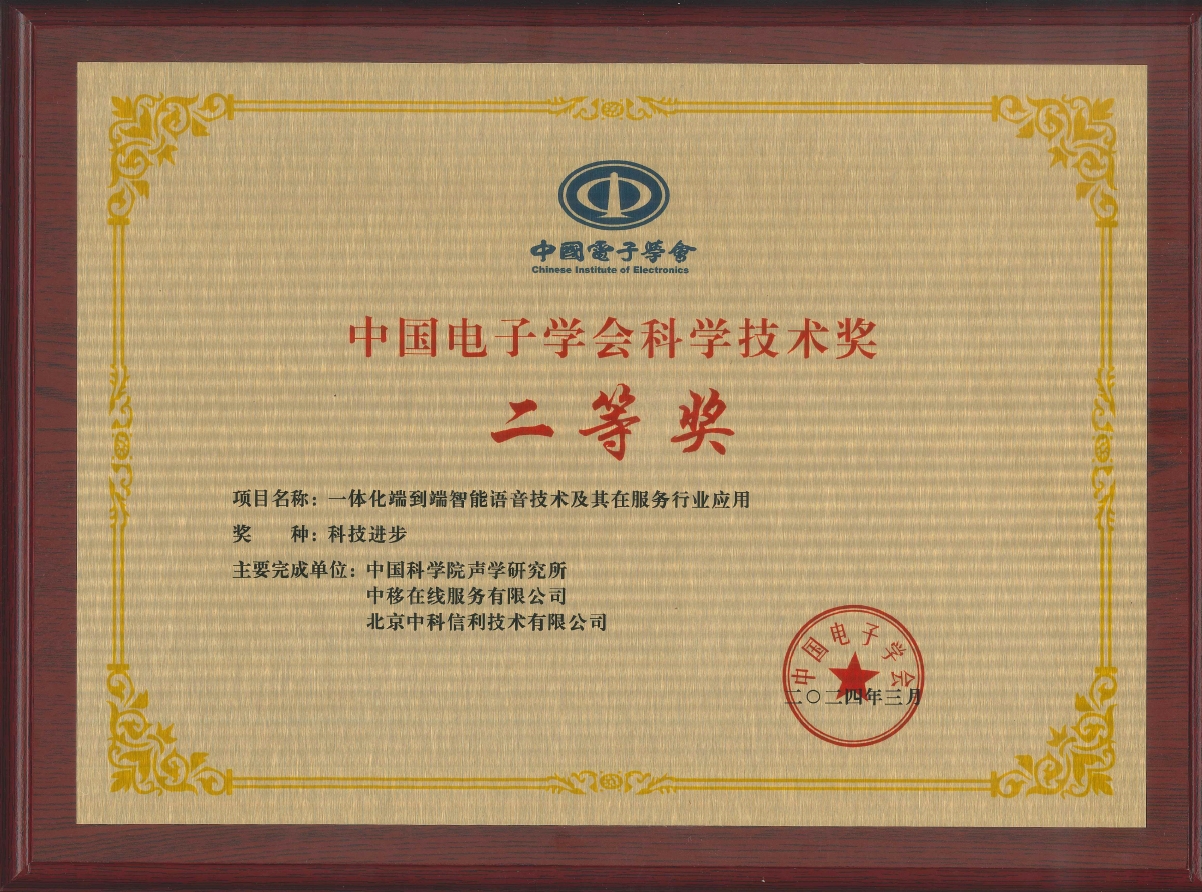 yx06永兴彩票集团与中移在线服务有限公司等合作研发的 “一体化端到端智能语音技术及其在服务行业应用”项目成果获得2023中国电子学会科技进步奖二等奖。