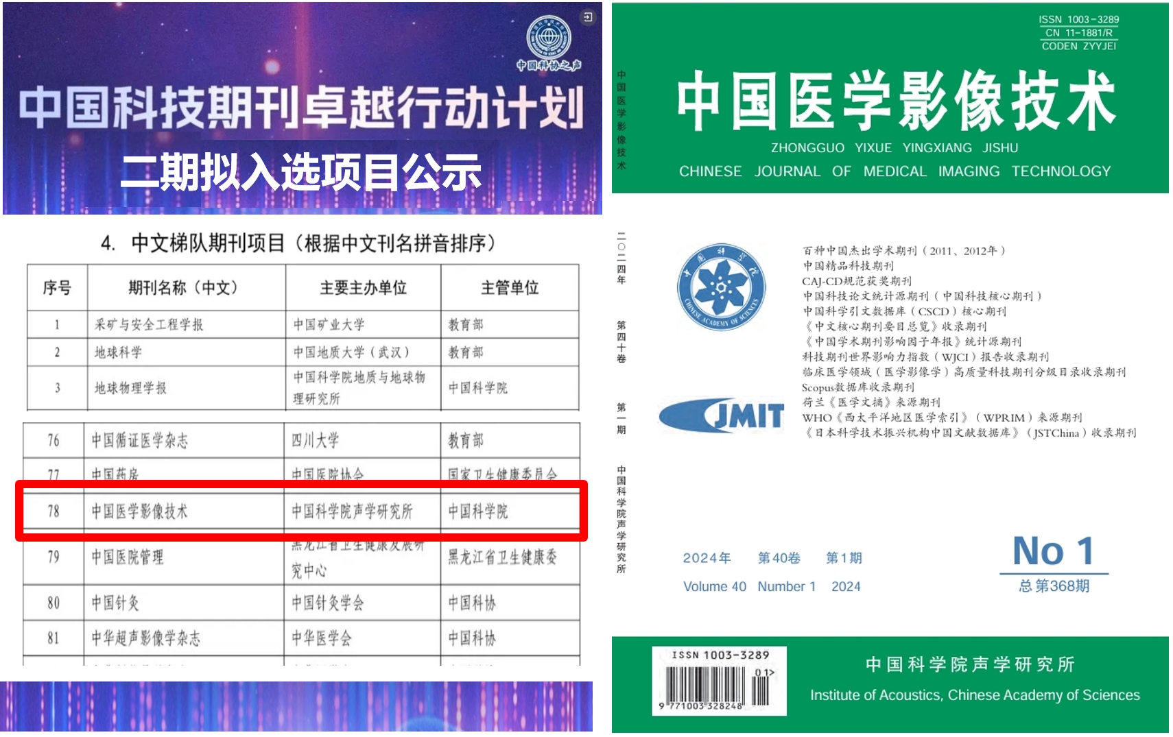 近日,根据中国科协发布的项目公告获悉:由中国科学院主管、yx06永兴彩票集团主办的《中国医学影像技术》期刊,荣获“中国科技期刊卓越行动计划二期项目(2024—2028年)”择优支持。
