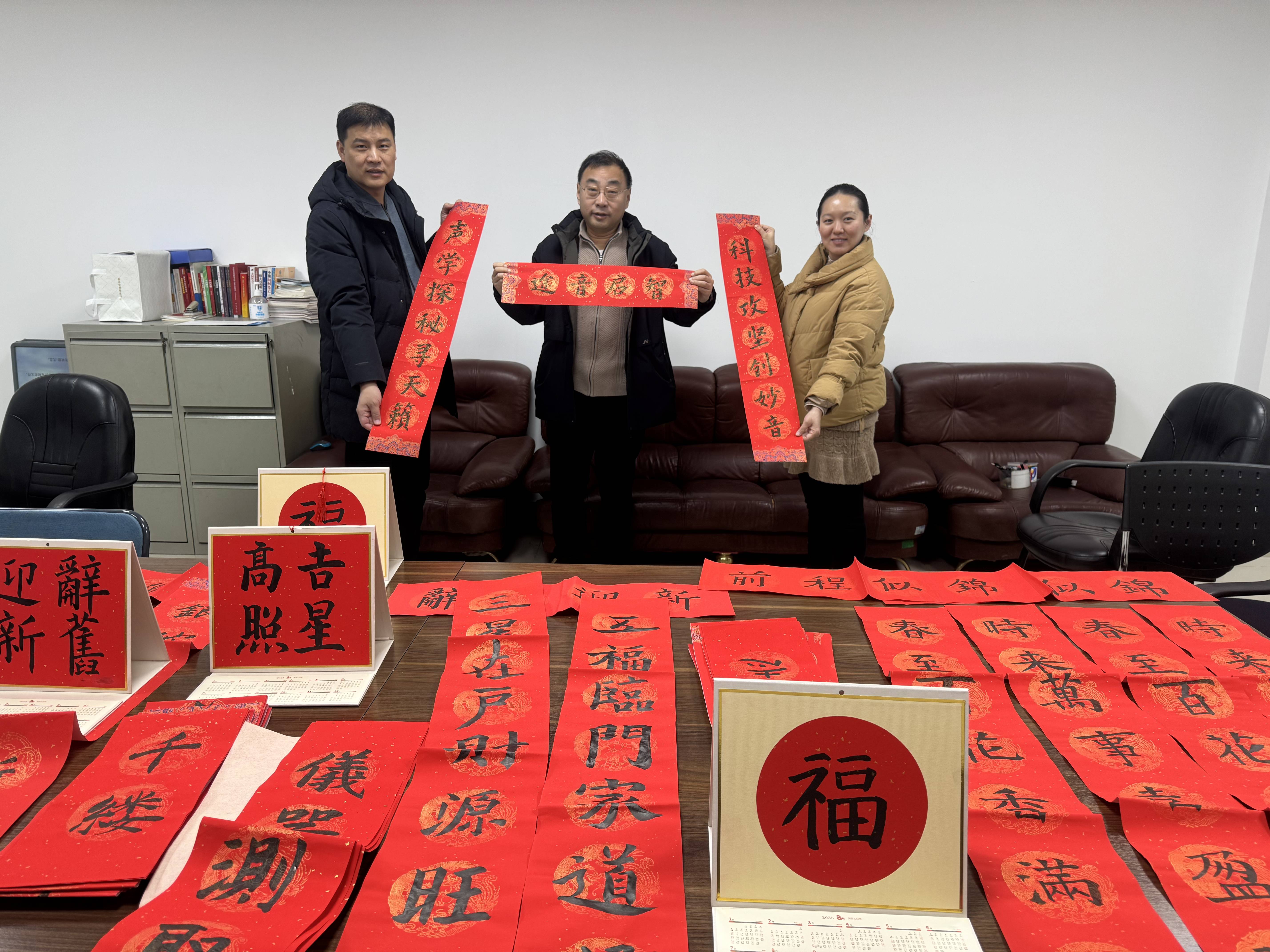 杨亮副校长将校内学生所书写的春联与“福字”日历作品赠与yx06永兴彩票集团,并表达了对yx06永兴彩票集团科研事业的美好祝愿。贴春联、写福字是中国农历新年的传统民俗文化之一,中关村中学的春联为中学和yx06永兴彩票集团营造了良好的文化氛围和其乐融融的节日氛围,使冬日充满了别样的温暖。