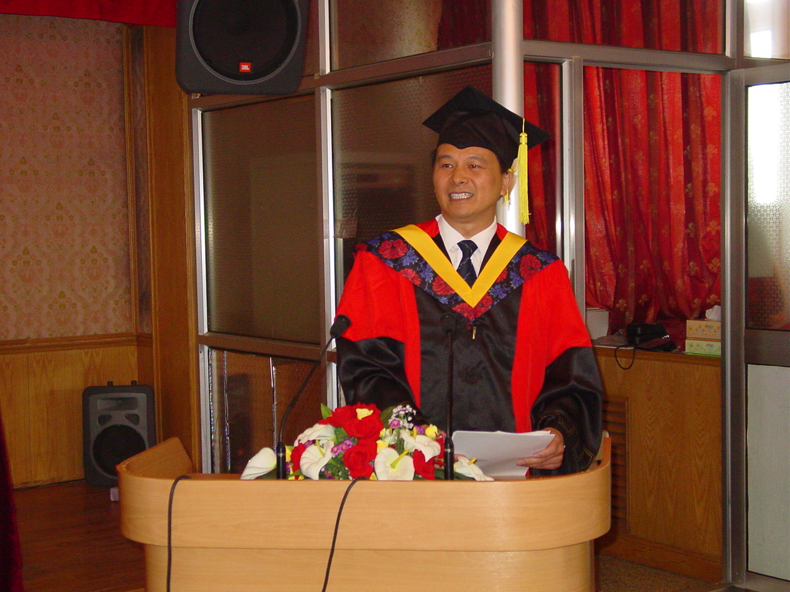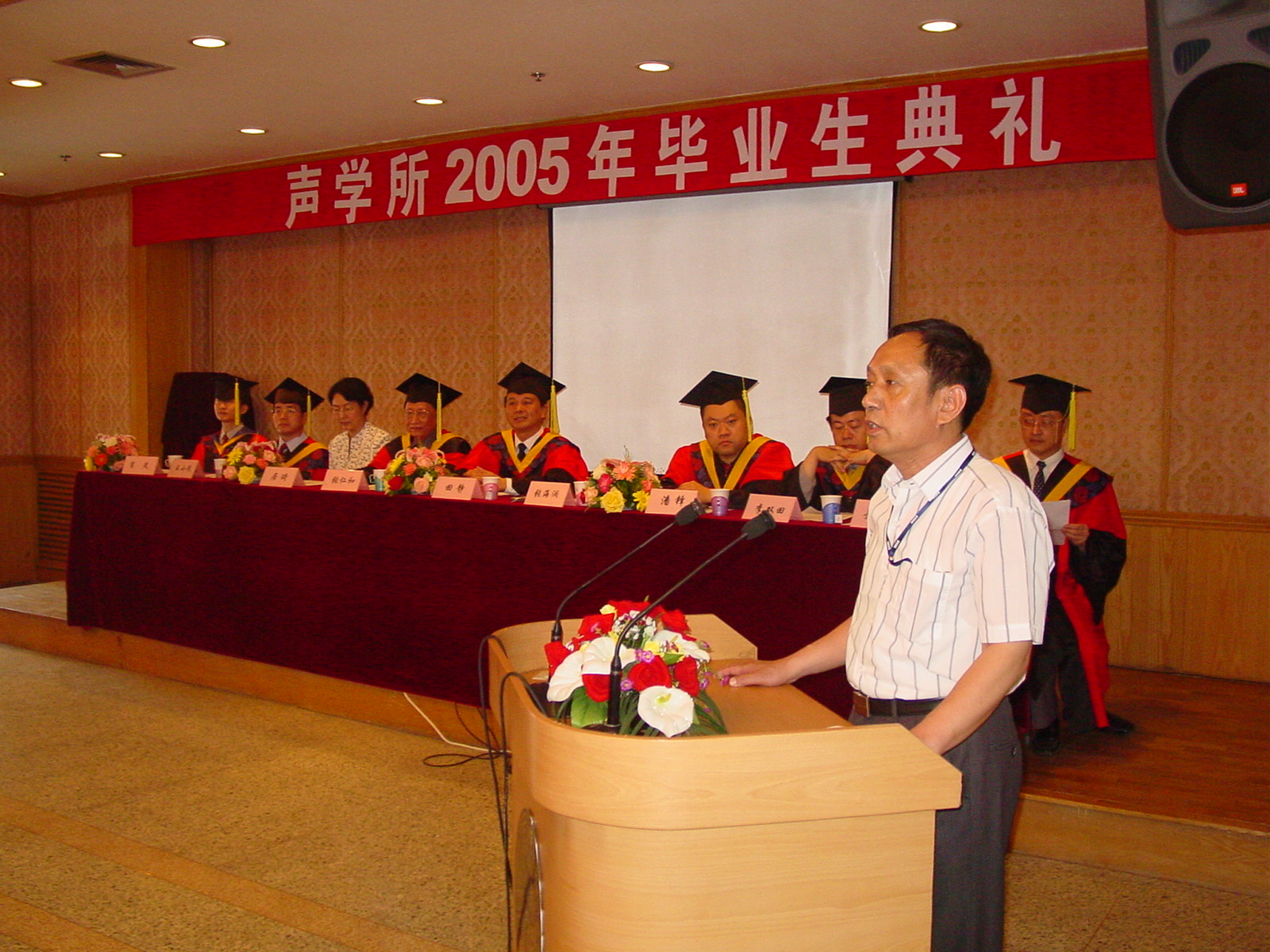 2005 年6月20日上午yx06永兴彩票集团2005年毕业生毕业典礼在DSP大楼多功能厅隆重举行。在主席台就坐的有所学位评定委员会主席、所长田静博士、张仁和院士、潘峰副所长、居琦副所长、学术委员会主任张海澜博士、所长助理李双田博士、所长助理王小民博士和所学位评定委员会委员肖灵博士等。毕业典礼由景荣才副所长主持。